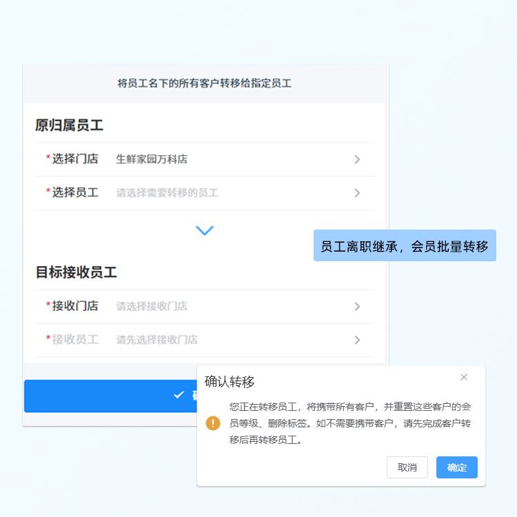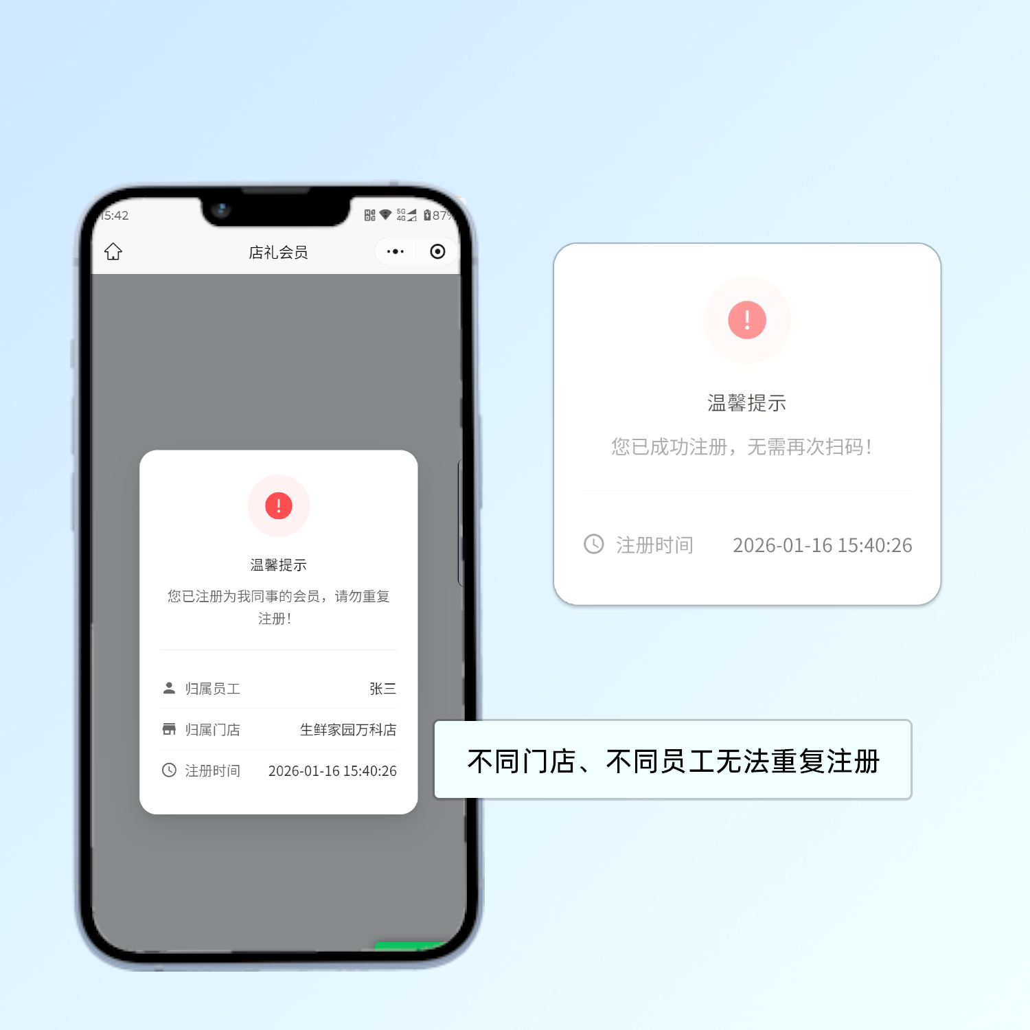 一个经销商老板有多家店或者多个部门,多个员工,杜绝同一个客户去不同员工下加入新会员,重复领取新人福利。