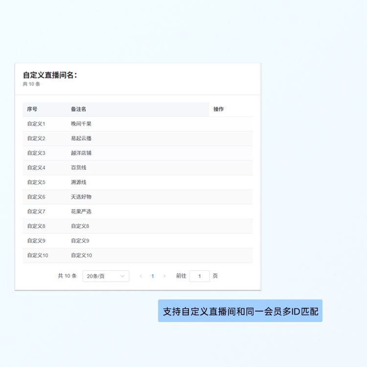 除了主流的灵播app、微鲸灵app、微赞、小鹅通、千果、诺云/亿起播、企业微信外,还支持10个自主搭建的直播间,且无需下载模版改表,每个自定义直播间均可以按实际平台改名;真正做到了任意直播间只要有 id,就能按 id 匹配!